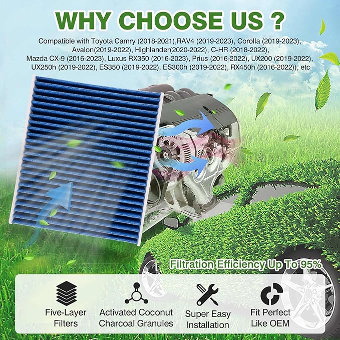 - 【Compatible Vehicles】 The cabin air filter Compatible with Toyota Camry(2018-2024), RAV4(2019-2025), Corolla(2019-2026), Avalon(2019-2022), Highlander(2020-2026), C-HR(2018-2022), Mazda CX-9(2016-2025), Luxus RX350(2016-2024), Prius(2016-2024), UX200(2019-2022), UX250h(2019-2026), ES350(2019-2026), ES300h(2019-2026), RX450h(2016-2022) and more. See below for detailed models.