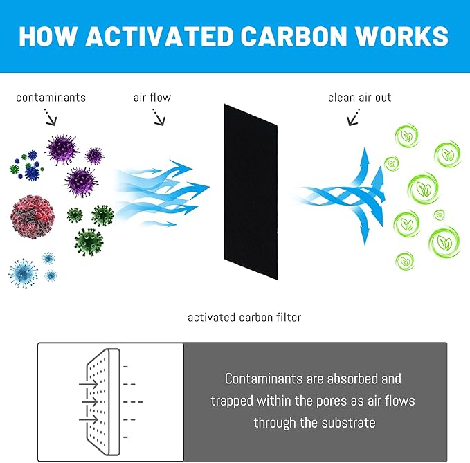 - Safe Material: These activated carbon filters (fibrous) are made of high-quality powdered activated carbon as the adsorption material, and the high-density polymer binding material is used to attach the carbon to the fiber. With the thickness of 0.5cm (0.2"), the filters can efficiently absorb odors.