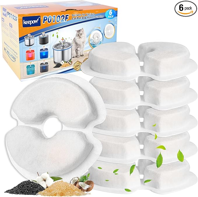 KEEPOW Pet Fountain Filter Replacement for 67oz/2L & 84oz/2.5L - 6 Pack Cat Fountain Filter Compatible With Plastic & Stainless Steel