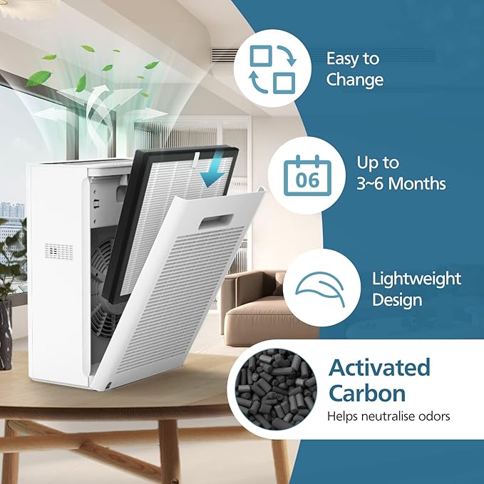 - ใ3 STAGE OF FILTRATIONใThe premium G3 filter adopts 3 stage HEPA filtration technology, which includes a Pre-Filter, HEPA Filter, and Activated Carbon Filter. This ensures it effectively clean up nearly all kinds of airborne particles as small as 0.3 microns, as well as unwanted odors, including pet dander, dust, PM2.5, pollen, smoke, tiny particles, and VOCs. It provides your family with clean and fresh air, promoting a healthier living environment.