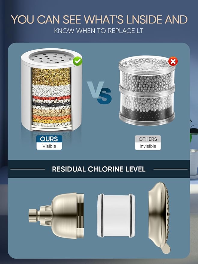 - 【16 Stage Shower Filter】16-stage filter adopts KDF-55, Calcium Sulfite, Vitamin C Balls, Acid-washed active carbon, Negative Ion Balls, Defluoride Particles and other filtering materials, ensure maximum reduction of Chlorine, heavy metals (lead, mercury, nickel, chromium) and other harmful substance in your shower water.Soften water quality, providing you with the cleanest and most comfortable water flow.
