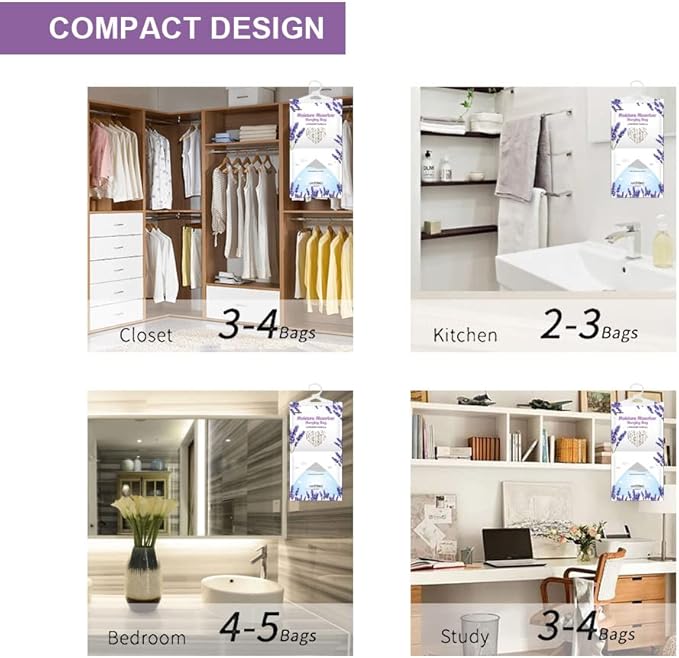 - 【Easy to use】The dehumidifier bag is easy to use and only needs to be hung in the required enclosed area. They can create clean and fresh air for you, and let you enjoy dry and comfortable indoor environment for a long time.