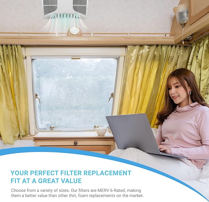 - ADVANCED FILTRATION TECHNOLOGY: Going beyond typical stock filters, the RV Air filter is designed with 40 layers of unwoven polyester. This intricate design ensures the capture of even the tiniest particles, ranging from 3 to 10 microns in size, earning us a MERV 6 rating. Elevate your travels with a filtration system that goes beyond standard camper filters.
