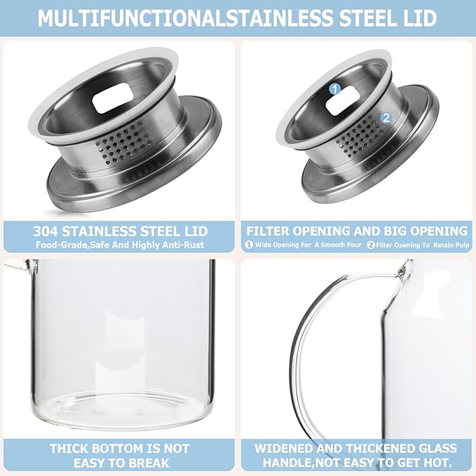 - LOOSE, TIGHT AND STAINLESS STEEL LID: The lid is made of 304 stainless steel. If the lid becomes loose when pouring water, remove the silicone ring from the lid and put it in the opposite direction, and the lid will become tight. The lid is detachable and has a smooth surface, it has two outlets, one for fast water pouring and the other for filtration, great for keeping ice, large chunks of fruit, and tea bag inside the pitcher; also because of the two outlets the pitcher is not airtight