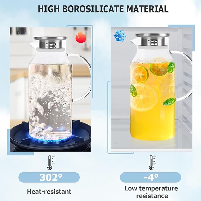 - PREMIUM QUALITY BOROSILICATE GLASS JUG: Glass jugs are thicker than ordinary glass jugs. Made of high-quality borosilicate glass. lead-free, lightweight, and durable, Our water glass jug can withstand temperatures from -4 ° F to 302 °F. Thick glass has strong impact resistance and resistance to high and low temperatures, so you can pour boiling water into this drink pitcher safely