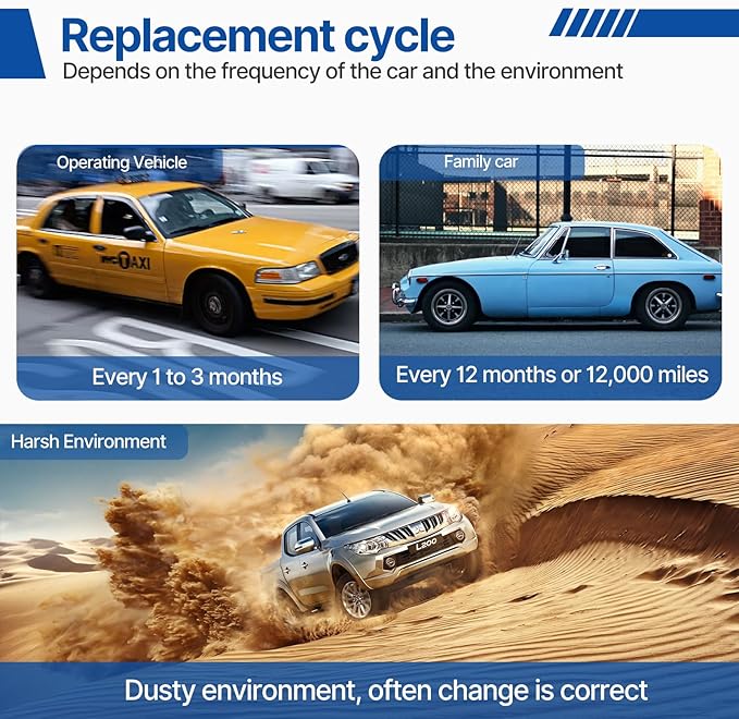 - Replace on Time: Cabin air filter is kind of consumable as dust and dirt will accumulate on the inlet surface, filtering effect decreases with increasing use time. Different use scenarios, the replacement time is not the same