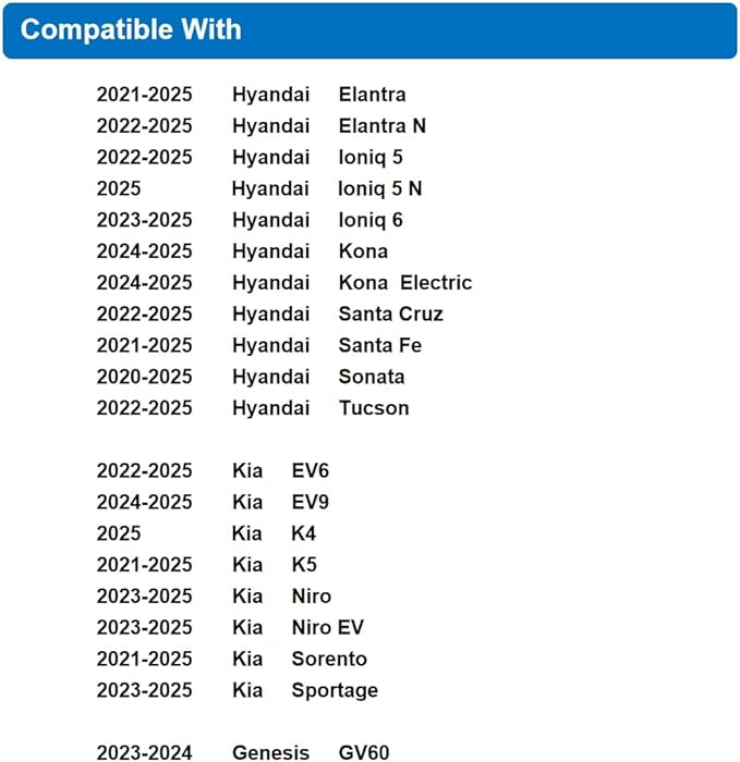 - 【Compatible with】2023-2024 Genesis GV60,2021-2025 Hyundai Elantra,2022-2025 Elantra N,2022-2025 Ioniq 5,2025 Ioniq 5 N,2023-2025 Ioniq 6,2024-2025 Kona,2024-2025 Kona Electric,2022-2025 Santa Cruz,2021-2025 Santa Fe,2020-2025 Sonata,2022-2025 Tucson,2022-2025 Kia EV6,2024-2025 EV9,2025 K4,2021-2025 K5,2023-2025 Niro,2023-2025 Niro EV,2021-2025 Sorento,2023-2025 Sportage,replacement cabin air filter,Verify Fitment by Using Amazon Comfirmed Fit
