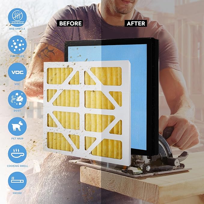 - 【Excellent Performance】The upgraded MERV-11 Pre-Filter collect large particles,such as dust, lints, hair, Fiber,pet dander, High-quality HEPA 550 filter collect 99.97% of airborne particles 0.3 microns in size. The activated carbon filter layer is designed to purify unwanted gases such as Vocs, smog,smoke, pets odors,cooking smells and more