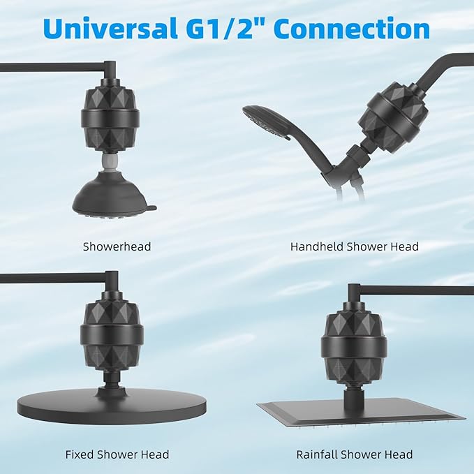 - Full Compatibility: Featuring universal G1/2" threads, our shower filters fit onto any standard shower pipe, arm, or extender. Experience effortless installation with our universal shower filters, which can be easily placed on wall-mounted, handheld, rainfall, and combo shower heads for versatile home use. Safeguard your entire household by effectively filtering out dirty water from every shower!