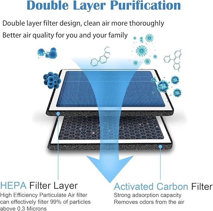 - 【Scientific Design, Strong and Durable】·HEPA Filter Layer,High Efficiency Particulate Air filter can effectively filter 99% of particles above 0.3 Microns.·Activated Carbon Filter,Strong adsorption capacity.Double layer filter design, clean air more thoroughly.Honeycomb Skeleton,The honeycomb geometric design is not easy to deform, which can prolong the life of the filter.
