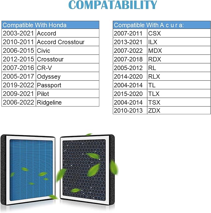 - 【Compatible with Acura 】HEPA filter Compatible with Acura 2007-2011 CSX / 2013-2021 ILX / 2007-2022 MDX / 2007-2018 RDX / 2005-2012 RL / 2014-2020 RLX / 2004-2014 TL / 2015-2020 TLX / 2004-2014 TSX / 2010-2013 ZDX