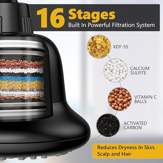 Filtered Shower Head with16 Stage Shower Filter Cartridge High Pressure 7 Spray Settings Shower Head Filter for Hard Water Removes Chlorine and Heavy Metals, Black