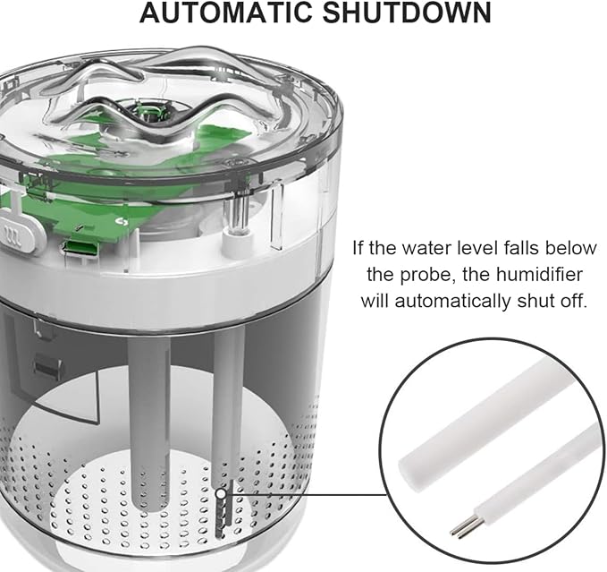 - 【Power Failure Protection】The air humidifier is equipped with an internal water level sensor, and all spray modes automatically shut off when the water level in the tank is below the probe. This feature ensures safety by eliminating potential hazards. The strong seal prevents accidental leaks, providing peace of mind even when liquid is accidentally tipped in.
