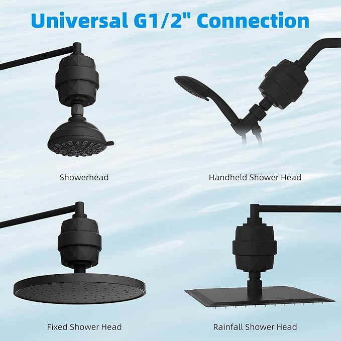 - Full Compatibility: Featuring universal G1/2" threads, our shower filters fit onto any standard shower pipe, arm, or extender. Experience effortless installation with our universal shower filters, which can be easily placed on wall-mounted, handheld, rainfall, and combo shower heads for versatile home use. Safeguard your entire household by effectively filtering out dirty water from every shower!