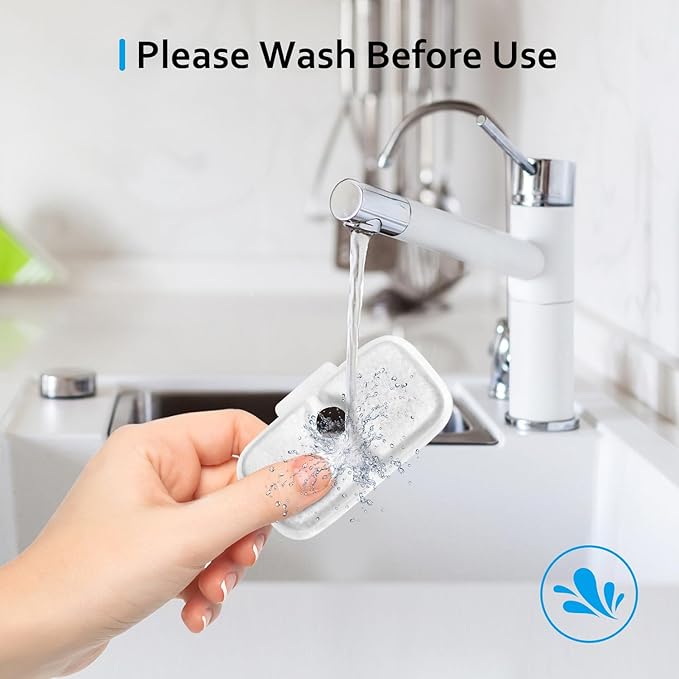 - 【Replace Regularly】: Please soak the filter in water for 3 minutes before use and rinse thoroughly under running water. Replace the cat water dispenser filter once in 1-2 weeks in summer and once in 2-4 weeks in winter to ensure clean drinking water. More frequent changes if more than one pet is using the water fountain;