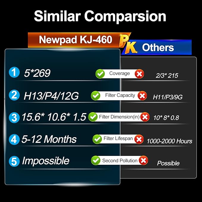 - Durable Replacement Filter - Unlike other small and poor filters with 1000-2000 hours life, our filter can last at least five months even if you run it 7/24, or even a year if you make a reasonable schedule with the APP. Search for 'B0BJZPMW53' or 'newpad replacement filter for KJ-460' to get the official replacement filter.