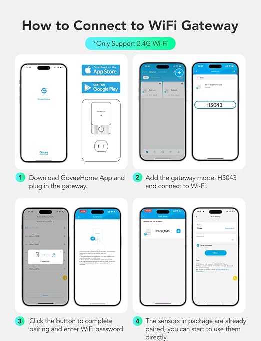 - Smart WiFi Temperature Sensor: With the 3 included sensors, you can easily monitor temperature and humidity data in real time from anywhere with the APP. WiFi gateway supports pairing up to 30 sensors to extend your monitoring range to any location indoors and outdoors.(not support 5G WiFi)