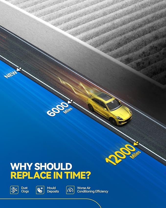 - Warm Recommend: Replace every 12 months or when it drives to 12,000 miles. If you often drive in heavily polluted areas and muddy roads, it is recommended that you replace them frequently to keep the air fresh in the car