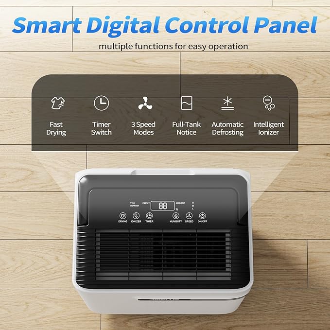 - MULTIPLE FUNCTIONS: AIRPLUS dehumidifier for basements boasts a user-friendly control panel with clearly labeled buttons for easy operation. You can press DRYING for strong dehumidification, HUMIDITY for customized settings, TIMER for auto-start and auto-stop, SPEED for adjusting fan speed, and IONIZER for purifying the air in your room.
