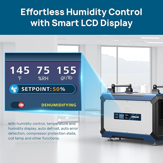 - User-Friendly Design: The compact and professional design of our crawl space dehumidifier makes it easy to operate across various applications. Adjustable humidity settings, a clear temperature display enhance usability, auto check machine fault Function, memory start, GPP mode, and lower noise levels ensuring optimal performance tailored to your needs.