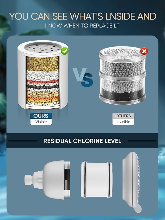 - 【16 Stage Shower Filter】16-stage filter adopts KDF-55, Calcium Sulfite, Vitamin C Balls, Acid-washed active carbon, Negative Ion Balls, Defluoride Particles and other filtering materials, ensure maximum reduction of Chlorine, heavy metals (lead, mercury, nickel, chromium) and other harmful substance in your shower water.Soften water quality, providing you with the cleanest and most comfortable water flow.