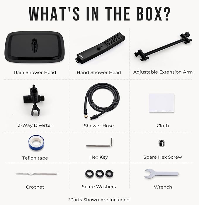 - ►PACKAGE INCLUDES: Rainfall shower head, handheld shower head, shower extension arm, shower hose, shower diverter and accessories