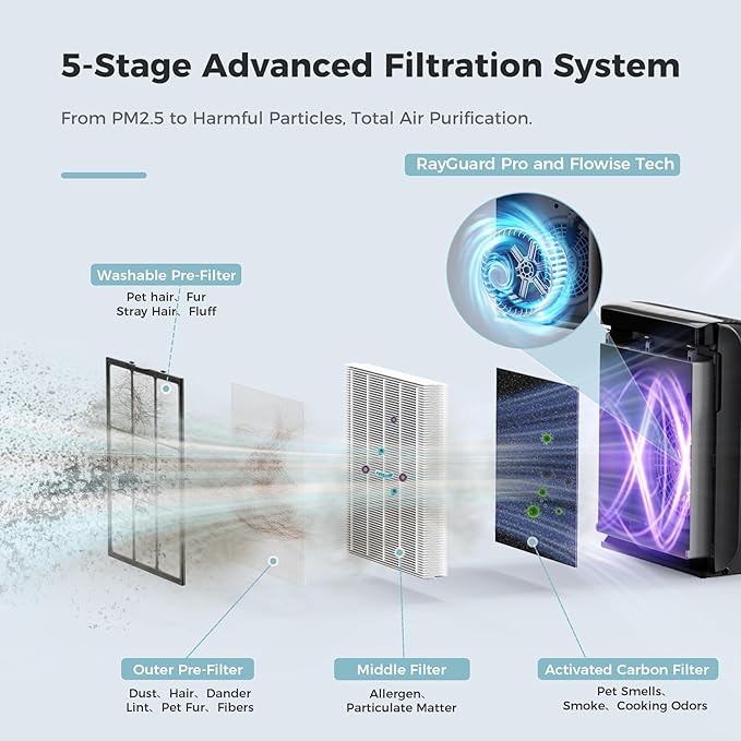 - Comprehensive Defense: This air purifiers, equipped with activated carbon, and a pre-filter, effectively removing particles and odors. The Filter captures pet dander and pollen, while activated carbon neutralizes odors, smoke. The washable filter included blocks pet hair, extending its lifespan for all-around purification