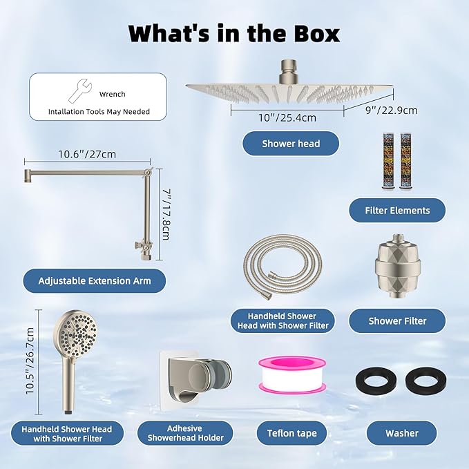 iFealClear Metal Rain Filtered Shower Head, 10” High Pressure Rainfall Shower Head with Handheld Spray, 10-Mode Handheld Power Wash, 16" Adjustable Extension Arm, 2 Pack Shower Filters, Brushed Nickel