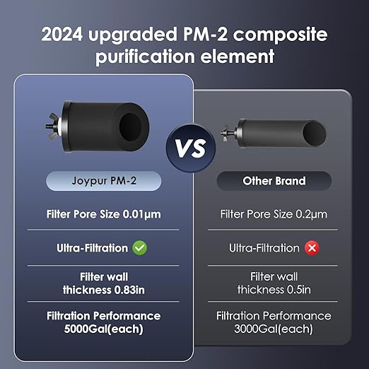 - [NEW UPGRADE] Joypur countertop water filter, with a new upgraded Austenitic 18/8 stainless steel, will not be corroded by the outside air and residual chlorine in the water, it is a healthy stainless steel, and set up a visible transparent water level window, no need to open the top cover to easily observe the water level. And the new upgraded black filter element PM-2 wall thickness increased to 0.83in, other brands only 0.5in-0.55in, greatly improves water contact area and filtration performance, so that the water is more healthy and safe.