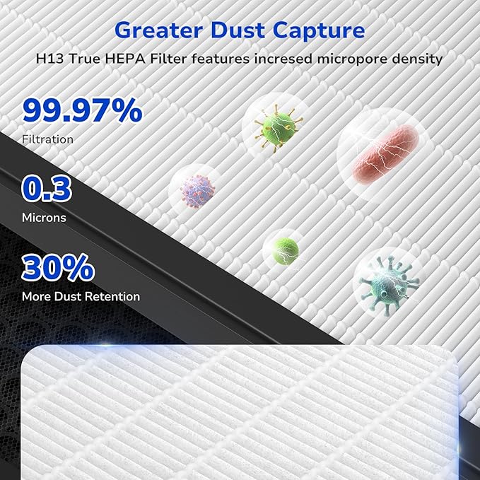 - High-Efficiency HEPA Filter: H13 True HEPA filter replacement for LEVOIT Vital 100S features upgraded microporous structure that boosts particle retention by 30% compared to general filters, capturing 99.97% of airborne particles down to 0.3 microns