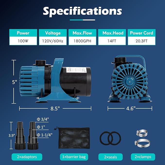- POWERFUL POND PUMP: The TONGCHANT 100W submersible water pump delivers 1800 GPH and lifts water up to 14ft, making it the perfect koi pond pump or fish pond pump for backyard fountains, waterfalls, and other pumps for ponds applications. It works well submerged or on land (best submerged).