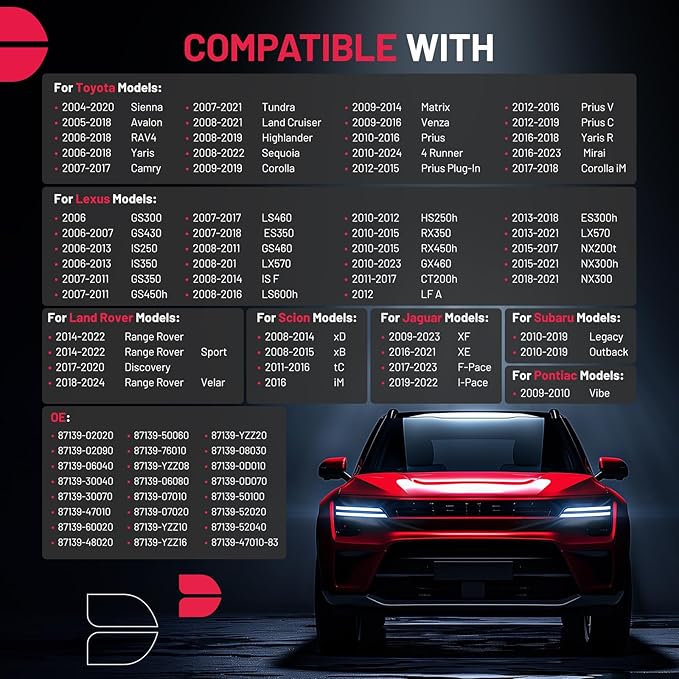 - 【Compatible Replacement】Compatible with Land Rover Models: 2014-2022 Range Rover, 2014-2022 Range Rover Sport, 2017-2020 Discovery, 2018-2024 Range Rover Velar; Compatible with Scion Models: 2008-2014 xD, 2008-2015 xB, 2011-2016 tC, 2016 im; Compatible with Jaguar Models: 2009-2023 XF, 2016-2021 XE, 2017-2023 F-Pace, 2019-2022 I-Pace; Compatible with Subaru Models: 2010-2019 Legacy, 2010-2019 Outback; Compatible with Pontiac Models: 2009-2010 Vibe