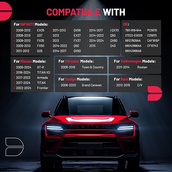 - 【Compatible Replacement】Compatible with Nissan Models: 2009-2024 GT-R, 2016-2024 TITAN XD, 2017-2023 Armada, 2017-2024 TITAN, 2022-2024 Frontier; Compatible with Chrysler Models: 2008-2016 Town Country; Compatible with Dodge Models: 2008-2020 Grand Caravan; Compatible with Volkswagen Models: 2011-2014 Routan; Compatible with Ram Models: 2012-2015 C/V