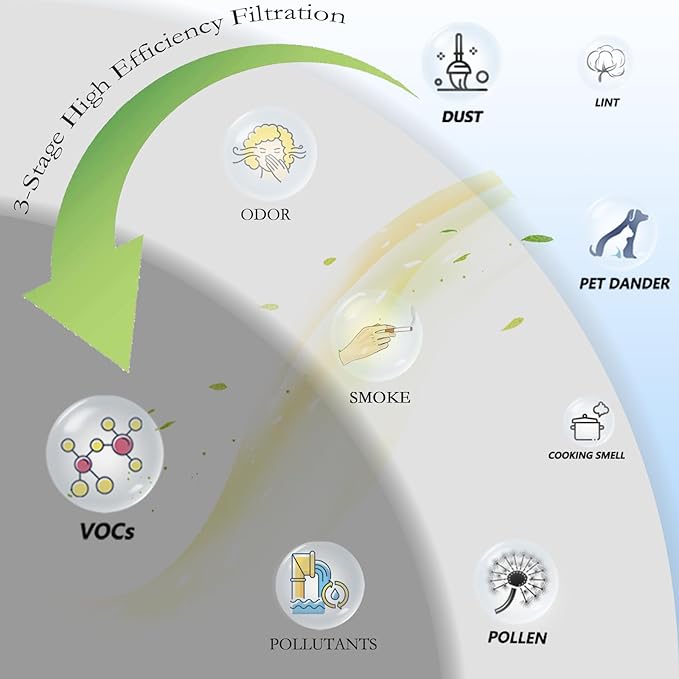 - ▍TRIPLE CLEAN DESIGN: ▍▹ PECO-HEPA filter utilizes a 3-layer filtration system consisting of a pre-filter, a HEPA filter and an activated carbon filter to efficiently improve the air quality in your bedroom and living room. Whether you are in your living room, bedroom, kitchen, office or basement or even in a confined space, it provides you with comfortable fresh air around the clock.
