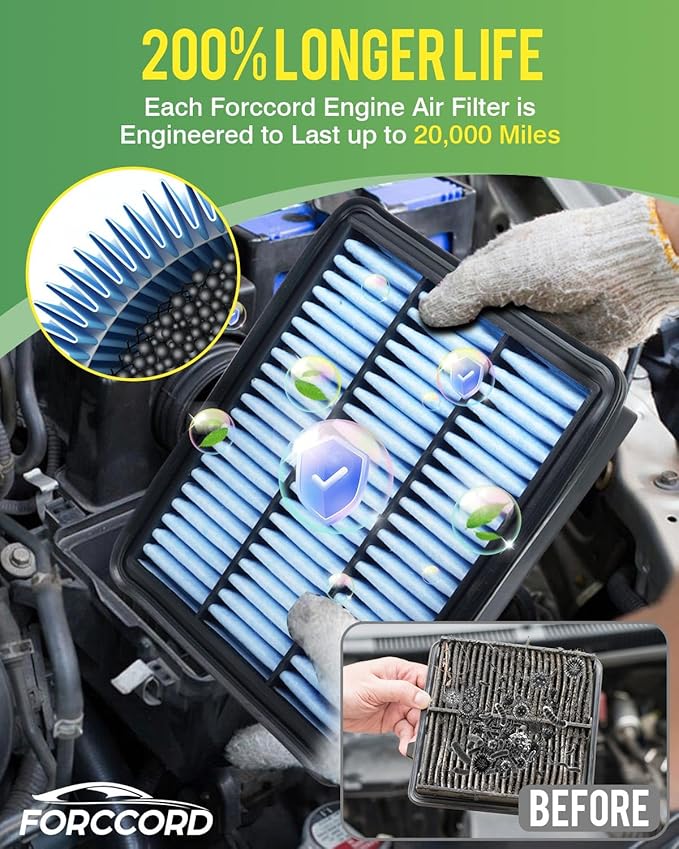 - 【 200% Longer Life】 Compare with Standard air filter, we adopts advanced HV filter paper with higher filtering precision, to absorb 99.9% of impurities (hair,fines,dust and flocs etc.).For the service life, each engine air filters are engineered to last up to 20,000 miles, 200% longer than the standard performance, less replacement.