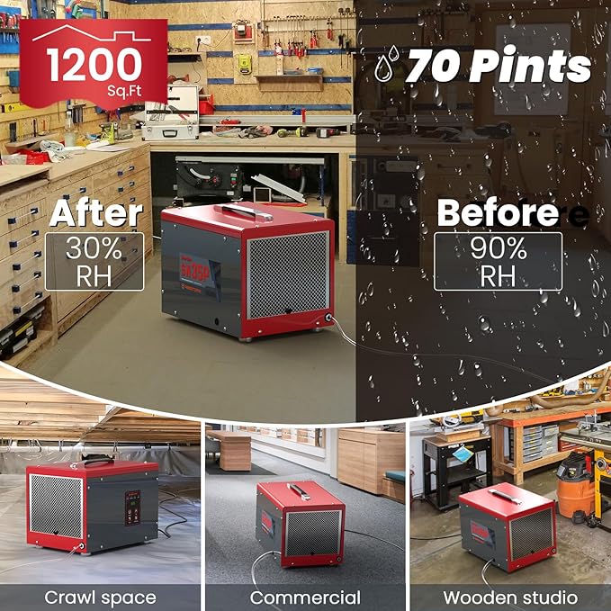 - 70-pint Dehumidifier:This commercial dehumidifiers can remove 70 pints per day of moisture from the air with less energy than other conventional dehumidifiers, is a great helper in saving energy and your money. It is suitable for large spaces up to 1,000 sq ft, such as crawl spaces, basements, storage areas, garage, laundry rooms or commercial use, you can maintain a healthy 45%-55% humidity range easily