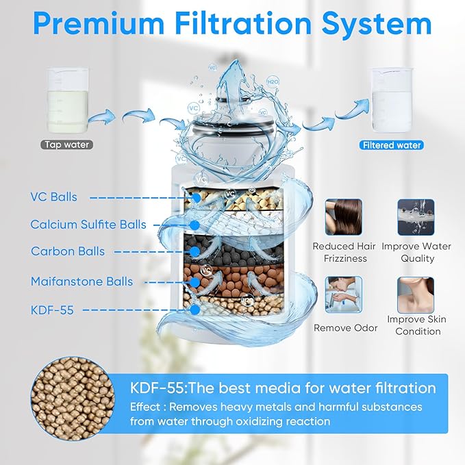 - 【High Quality Filtered Shower Head Configuration】: The filter can be easily removed and replaced. With superior KDF-55,Calcium Sulfite Balls, VC Balls,Maifanstone,Carbon Balls.Release more beneficial elements can effectively filter impurities and eliminate other harmful substances such as residual chlorine, bacteria, heavy metal ions, etc.Allows you to enjoy cleaner and healthier water while enjoying a relaxing shower