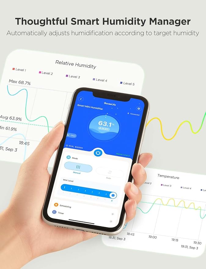 - Smart APP & Voice Control: Humidifier for Bedroom with APP control allows you control it anywhere, anytime. You can effortlessly set schedules, timer, add water alert and cleaning reminders. Besides, hands-free control through Alexa/Google Assistant helps you enhance a convenience life.(Only Support 2.4G Wi-Fi.)