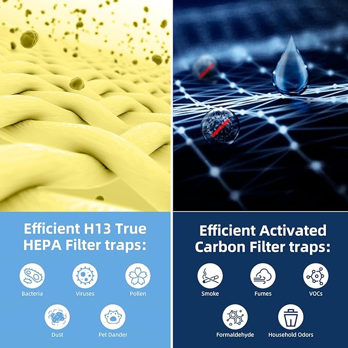 - 【H13 TRUE HEPA FILTER】: 3-in-1 True HEPA System High Efficiency Activated Carbon Filter, H13 Grade True HEPA Filter. Works 99.97% of airborne particles as small as 0.3 microns in size to attach, protecting your home from pet hair, pet dander and odors.