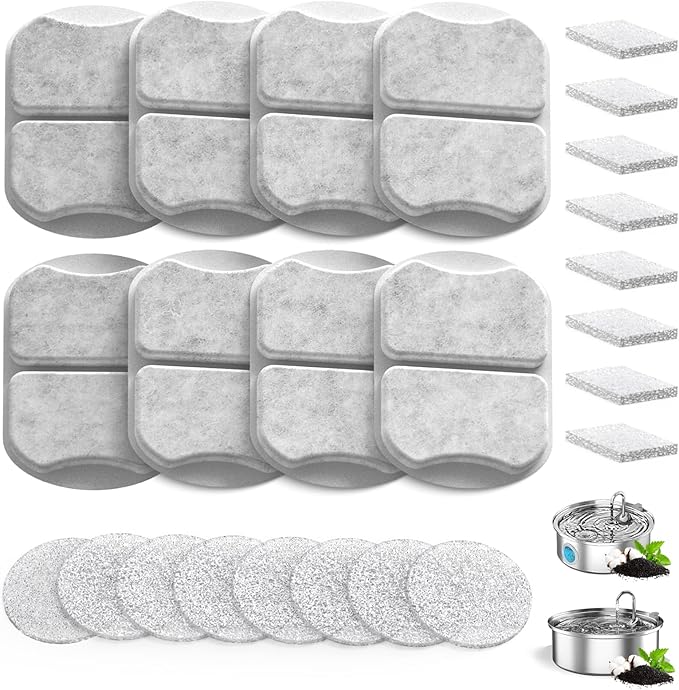 - Pre-Filter Sponge - The pet fountain filter replacement includes 8 filters, 8 square sponges and 8 round sponges. The high-density pre-filter sponge can better filter hair and debris, preventing clogging and damage to the pump, and prolonging the life of the fountain pump.