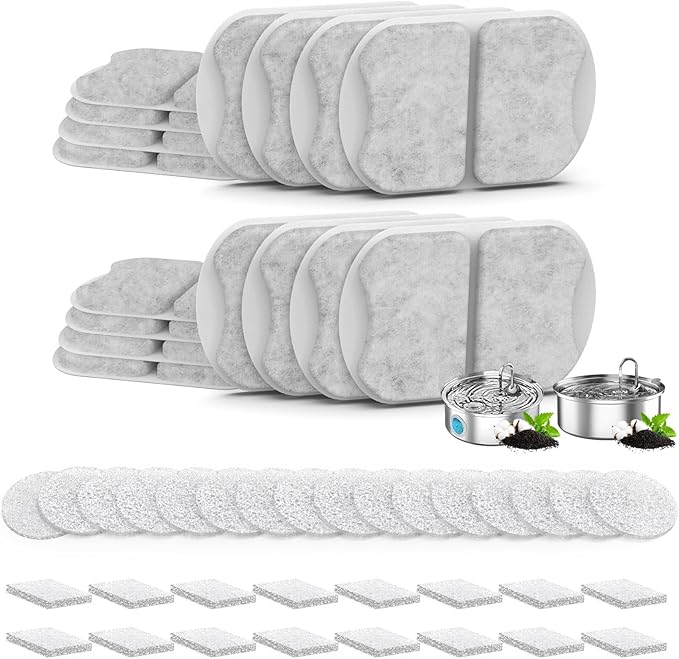 - Pre-Filter Sponge - The pet fountain filter replacement includes 16 filters, 16 square sponges and 16 round sponges. The high-density pre-filter sponge can better filter hair and debris, preventing clogging and damage to the pump, and prolonging the life of the fountain pump.