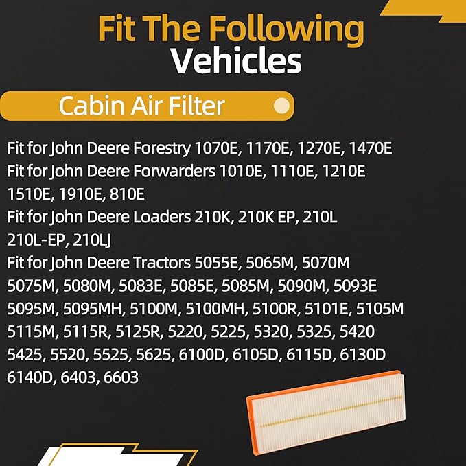 - 【Application】Cabin air filter fit for John Deere Tractor 5525, 5320, 5325, 5420, 5425, 5520, 5525, 5603, 5625, 5725, 6100D, 6110D, 6115D, 6125D, 6130D, 6140D, 6403, 6603; Fit for John Deere Loaders 210K, 210K EP, 210L, 210L-EP, 210LJ