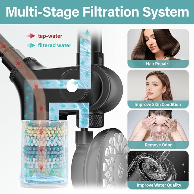 - 【Unique Magnetic Base】Our magnetic filtered shower head with handheld combo has a unique magnetic docking base. Its powerful magnetism can firmly attach the handheld shower head to the base without an additional shower bracket. Due to its magnetic attraction function, you can easily place and take the handheld shower head even with your eyes closed. In addition, the base can be swivelled 360°, making it easy to position the shower head at the suitable angle.