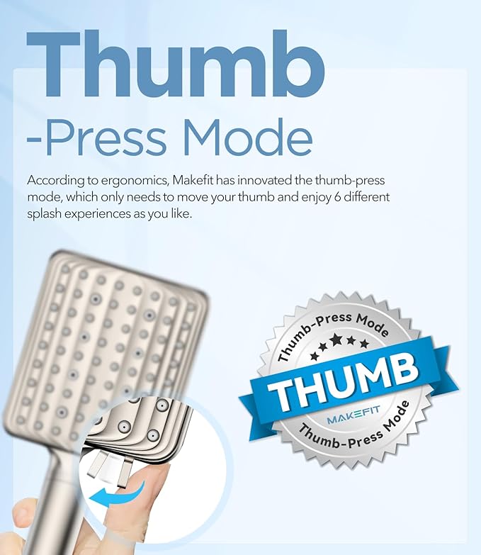 - Thumb-Press Mode Shower Head: MakeFit hand held shower head boasts a user-friendly design, featuring a single easy switch that allows seamless toggling between different modes with your thumb, providing convenience and ease of operation. And this shower head with handheld features 6 spray modes, including power rain, gentle mist, intense massage, and more, catering to your various showering needs