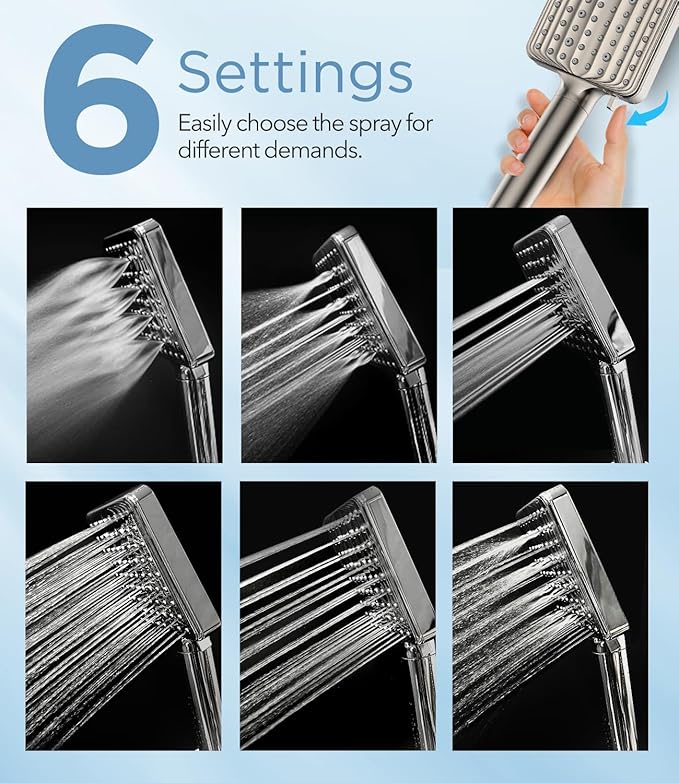 - Large Panel & Easy to Clean: This hand shower head features a unique large square panel and dense shower nozzles, specifically designed to maximize water coverage. This design not only reduces your showering time but also delivers a refreshing full-body showering experience. Additionally, the anti-clog nozzles effectively prevent lime and hard water build-up, making it easy to clean and maintain