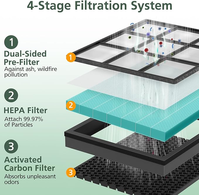 - 【4-IN-1 FILTRATION】 Our Vital 200S Smoke Remover replacement filter features 4-Stage Filtration System: ①②Dual-Sided Pre-Filter ③HEPA Filter ④Activated Carbon Filter. It's more effective against ash and pollution spread by wildfire smoke