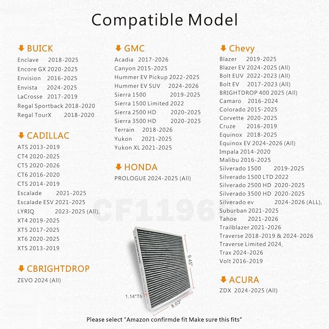 - Cabin air filter is suitable for Compatible with BUICK Enclave 2018-2024 (V6-3.6L)& 2025 (L4-2.5L), Encore GX 2020-2025 (L3-1.2L/1.3L), Envision 2016-2025 (L4-2.0L) & 2017-2020 (L4-2.5L), Envista 2024-2025 (L3-1.2L), LaCrosse 2018-2019 (L4-2.5L) & 2017-2019 (V6-3.6L), Regal Sportback 2018-2020 (L4-2.0L/V6-3.6L), Regal TourX 2018-2020 (L4-2.0L); Compatible with BRIGHTDROP ZEVO 2024 (All); ACURA ZDX 2024-2025 (All); HONDA PROLOGUE 2024-2025 (All); Please select "Amazon confirmde fit Make sure this fits"