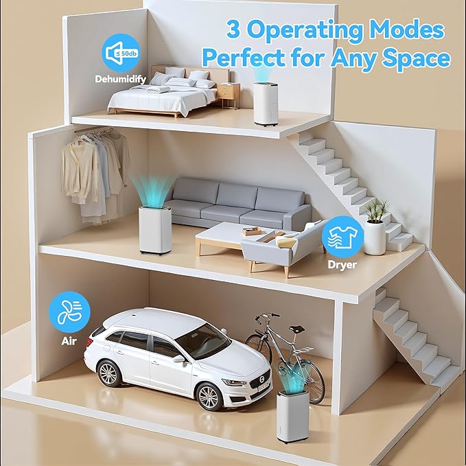 - 【3-in-1 Smart Dehumidification】 This advanced dehumidifier combines three powerful modes into one compact unit: In Dehumidify Mode, precisely adjust humidity levels between 30%-80% RH for customized comfort; switch to Dry Clothes Mode for automatic high-speed airflow (fixed humidity setting) to accelerate laundry drying; or use Fan Mode for pure air circulation without water collection.