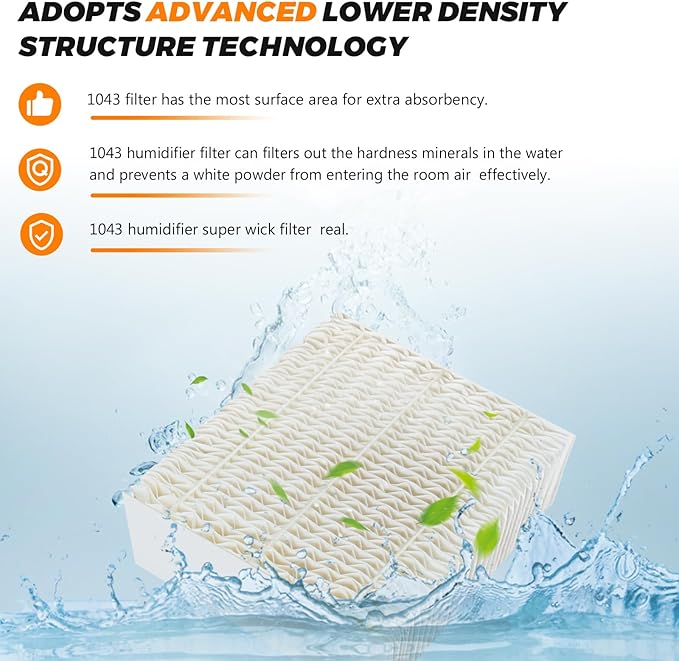 - √√【NEW UPGRADE HUMIDIFIER FILTERS 】: Upgraded 1043 humidifier super wick filter are made from more than 50 sheets strong and solid reinforced mesh paper with the hot glue strips, adopts advanced lower density structure technology. The dense structure makes 1043 humidifier wick filter have greater dust holding capacity and less resistance. Better transfer of moisture back to the air and effectively block particles and hardness minerals in hard water. Our 1043 humidifier wick filter is more efficient, less stress and better than older versions. This 1043 super wick humidifier filter is a good choise for you to to create a healthy and comfortable