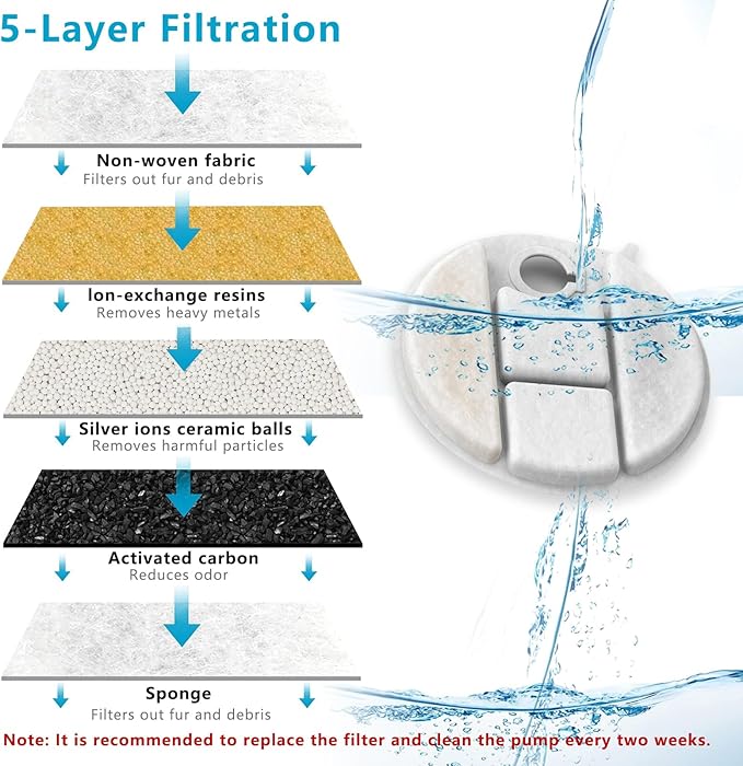 - 【Keep Your Pet Healthy】Each pet fountain filter is composed of non-woven facbric, activated carbon, ion exchange resins,sponge,silver ion ceramic ball. 5-stage filtration system for optimal clean hydration for your dog.